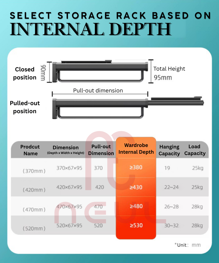 Effortlessly adjust the width of the rack to fit your closet space, ranging from 370mm to 520mm, ensuring a perfect fit for any wardrobe. -